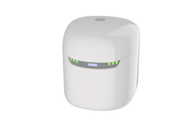 Kontaktní čisticí, vysušovací a dezinfekční nabíječka pro sluchadla Motion C&G P X. Během nabíjení se sluchadla 15 minut dezinfikují pomocí UV-C světla a 4 hodiny se vysoušejí. Indikace stavu nabití a procesu dezinfekce pomocí LED diod.